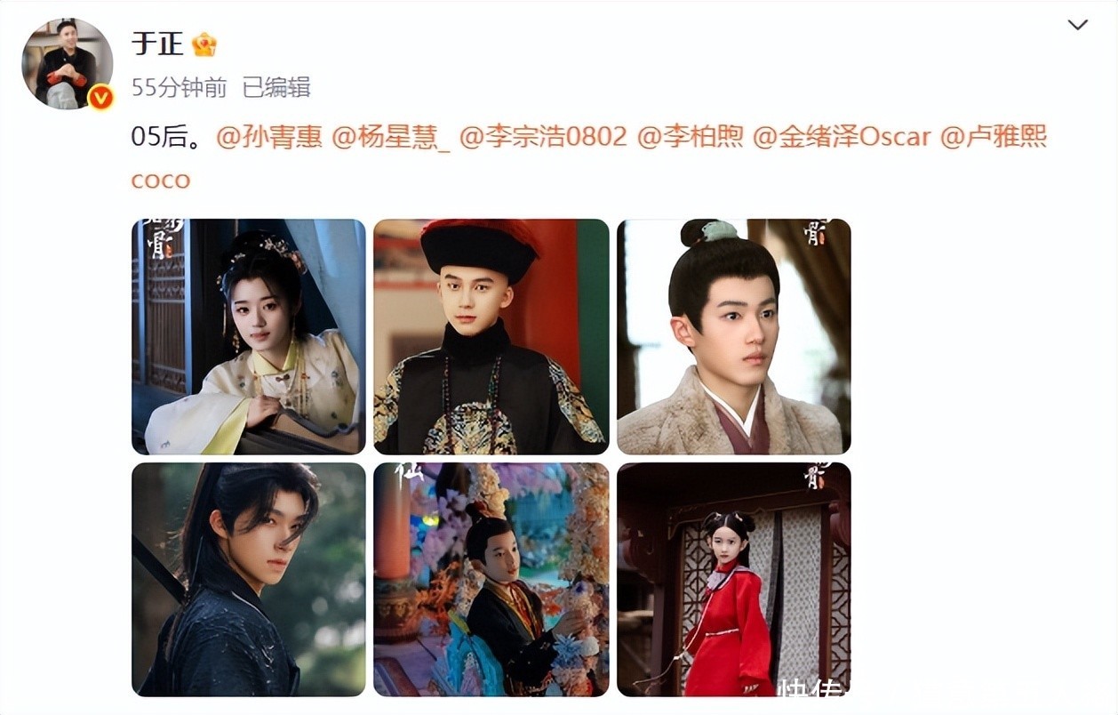 今天(21日),于正在应付平台晒出其新剧中6位05后新东谈主演员,分手是 @孙寈惠 @杨星慧_ @李宗浩 0802 @李柏煦 @金绪泽 Oscar @卢雅熙coco ,开启新的造星策划。